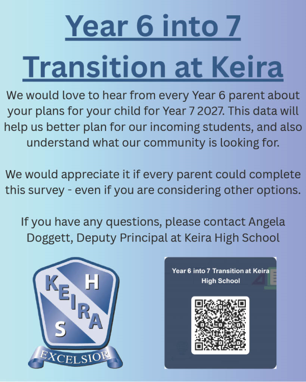 We hope you were able to visit the Keira High School Expo night recently. Please find a short 2min survey from Keira High School about your intentions for enrolment for your child - including those who are enrolling elsewhere. The survey can be found here by clicking on the link: Year 6 into 7 Transition at Keira High School or you can use the QR code attached.