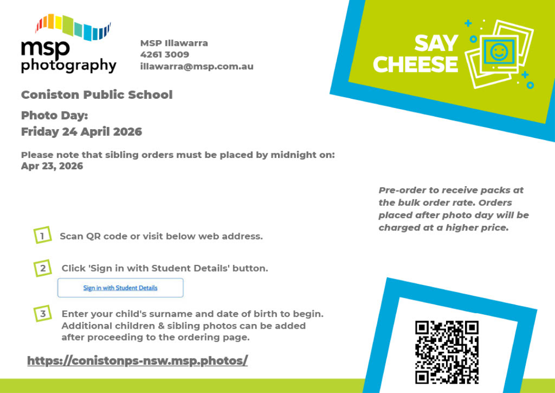 Our school photo day will be held on Friday 24 April 2026 (Term 2, Week 1). Families who already have an account will receive an email from MSP Photography with instructions. New families (or families who do not receive an email) can simply follow the instructions on the flyer attached. We will have some paper order forms available from the office shortly. Please note orders MUST be placed by midnight on April 23, 2026.