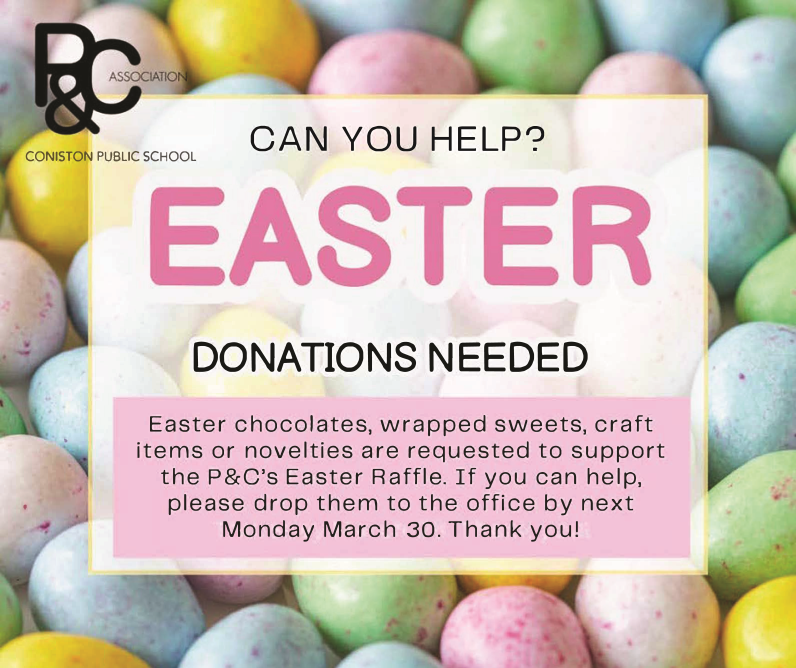 The P&C are kindly requesting any donations of easter eggs for Easter raffle being held during the Easter hat parade. Any donations can be made to the office by Monday 30 March.